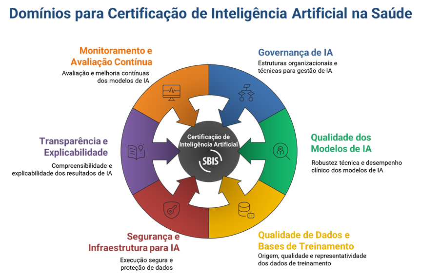 Os domínios definidos para a certificação são: Governança de IA; Qualidade dos Modelos de IA; Qualidade de Dados e Bases de Treinamento; Segurança e Infraestrutura para IA; Transparência e Explicabilidade e Monitoramento e Avaliação Contínua.